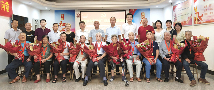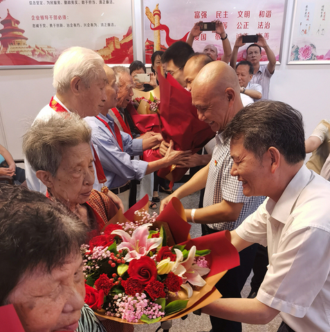 与会领导为到场的10名老党员一一颁发纪念章、献上鲜花,并与他们合影留念。