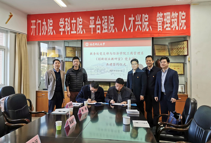 121日,教务处党支部和经济学院工商管理系(创新创业教研室)党支部在文经楼333会议室开展结对共建合作协议签署仪式。机关党委书记陈金章、教务处副处长(主持工作)黄欣沂、副处长杨发福、副处长宋原,经济学院党委副书记(主持工作)颜隆忠,副院长谢宏忠,工商管理系党支部书记魏国江以及教务处和工商管理系(创新创业教研室)党员代表参加了活动,活动由颜隆忠主持。
